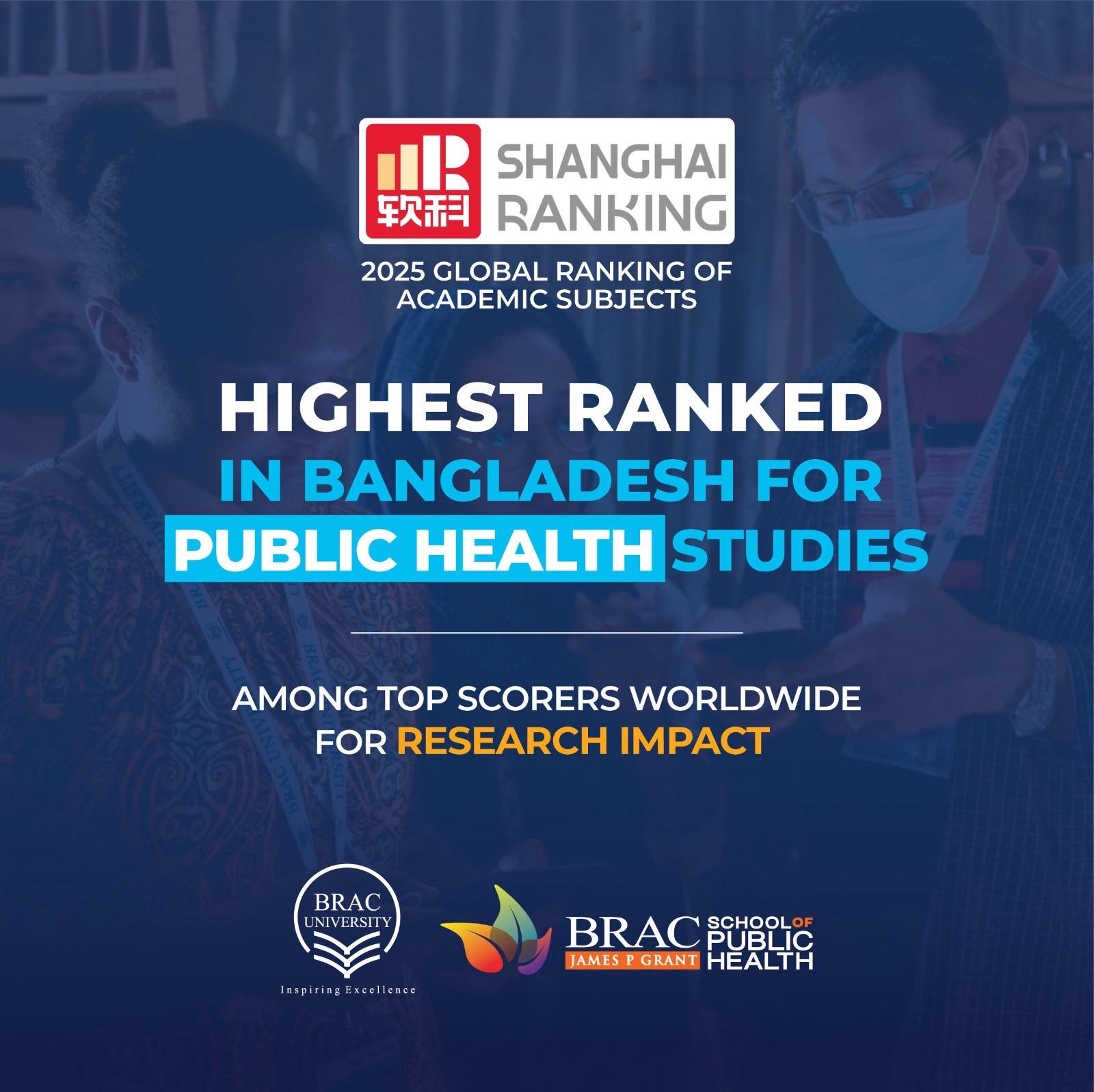 ব্র্যাক ইউনিভার্সিটি সাংহাই র্যাংকিংয়ের “২০২৫ গ্লোবাল র্যাংকিং অব অ্যাকাডেমিক সাবজেক্টস” এর পাবলিক হেলথ শিক্ষায় বাংলাদেশের সেরা বিশ্ববিদ্যালয়ের স্বীকৃতি লাভ করেছে। সম্প্রতি বিশ্বের বিভিন্ন বিশ্ববিদ্যালয়ের মোট ৫৭টি বিষয়কে এই র্যাংকিংয়ে মূল্যায়ন করা হয়েছে। এসব বিষয়ের মধ্যে রয়েছে ন্যাচারাল সায়েন্স, লাইফ সায়েন্স, চিকিৎসা বিজ্ঞান, Read more...
